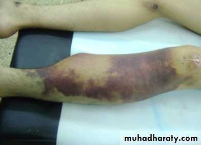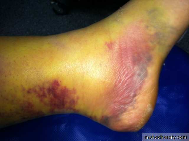Ankle and knee injuries should be excluded. May result from direct blow. Treated by pressure bandage and analgesia or P.O.P cast if pain persist