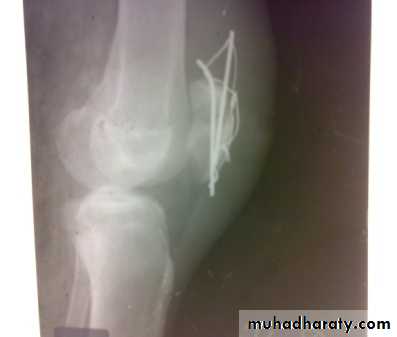 B- indirect force : lead to transverse fracture with gap between the fragments Caused by resisted extension ( sudden contraction of the quadrecepse muscle against resistant ). Associated with tears of collateral extensor expansions and failure of extensor mechanism (patient cannot elevate leg straight).