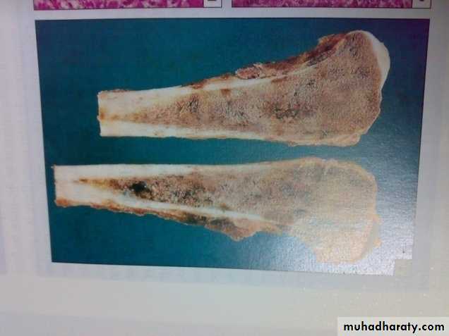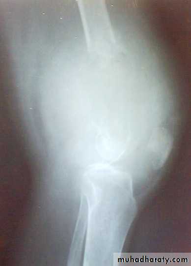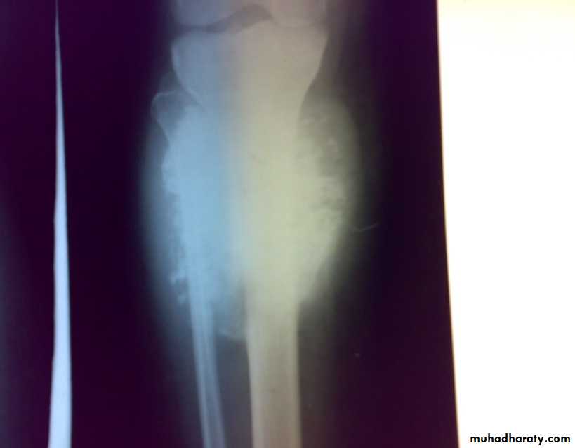 The metaphysis show osteolytic and osteoblastic areas, the cortex is usually perforated and soft tissue shadow may be seen.