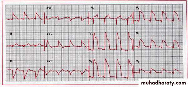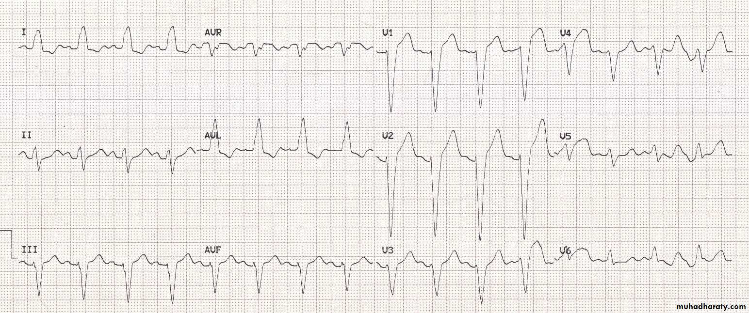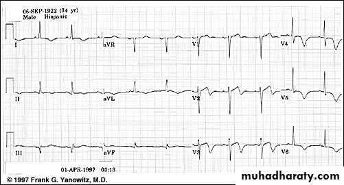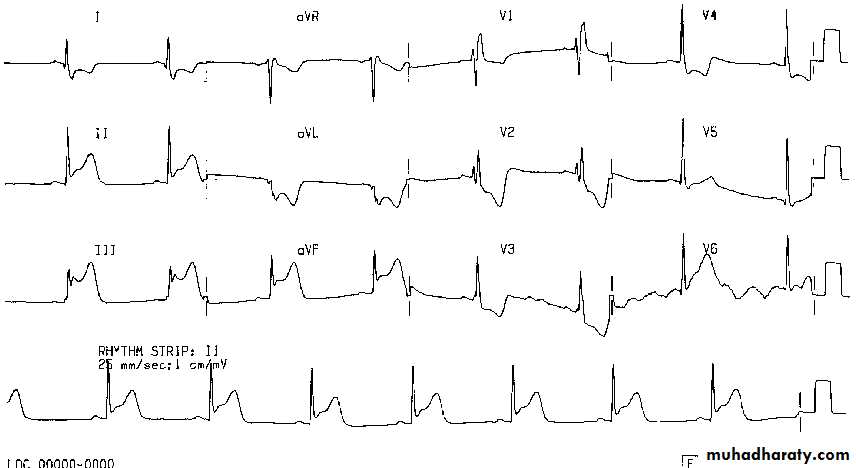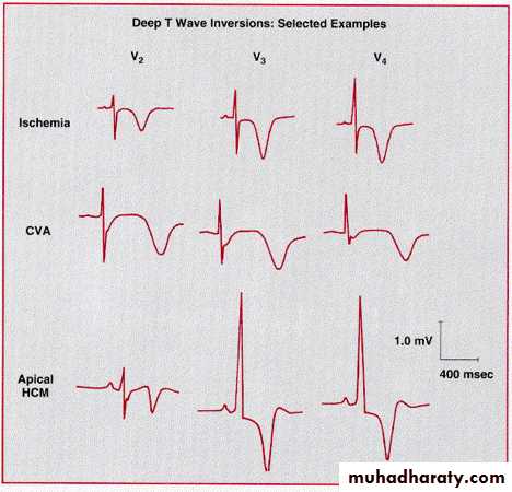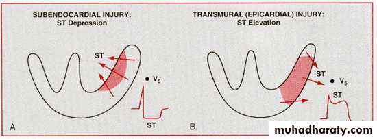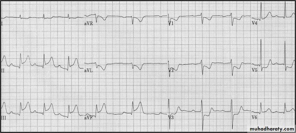 • Downward slopping or Horizontal depression of ST segment leading to T↓is significant of IHD