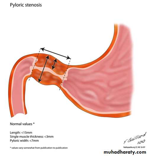 • U/S : confirms Dx in the majority of cases. Criteria include pyloric thickness 3-4 mm, an overall pyloric length 15-19 mm, and pyloric diameter of 10-14 mm. It has a sensitivity of ∼95%.