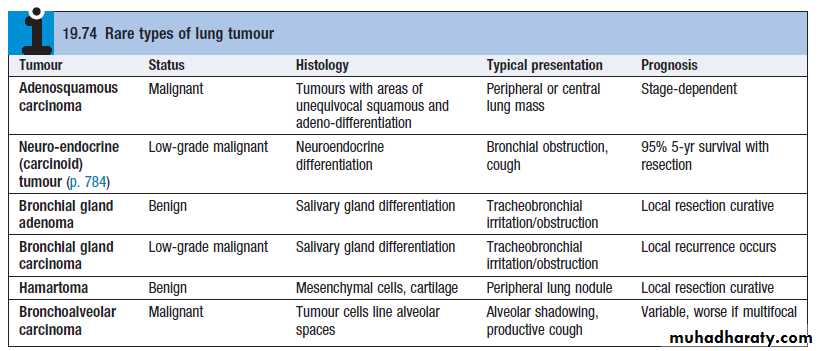 Prognosis : The overall prognosis in bronchial carcinoma is very poor, with around 70% of patients dying within a year of diagnosis and only 6-8% of patients surviving 5 years after diagnosis. The best prognosis is with well-differentiated squamous cell tumours that have not metastasised and are amenable to surgical resection.