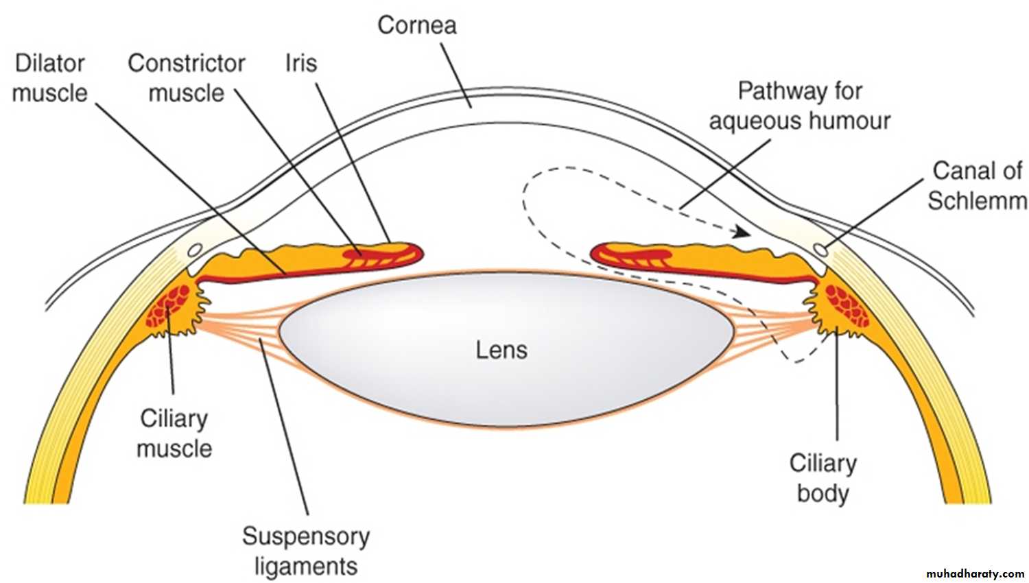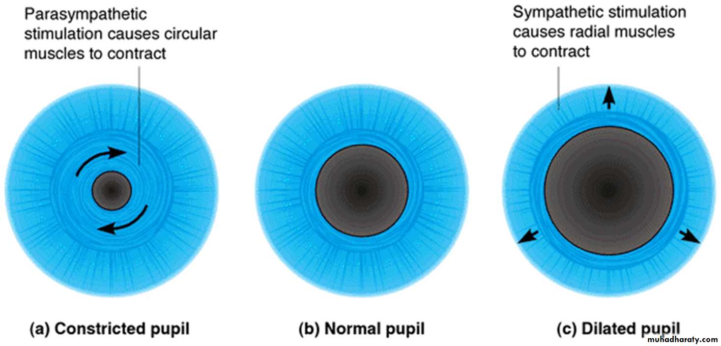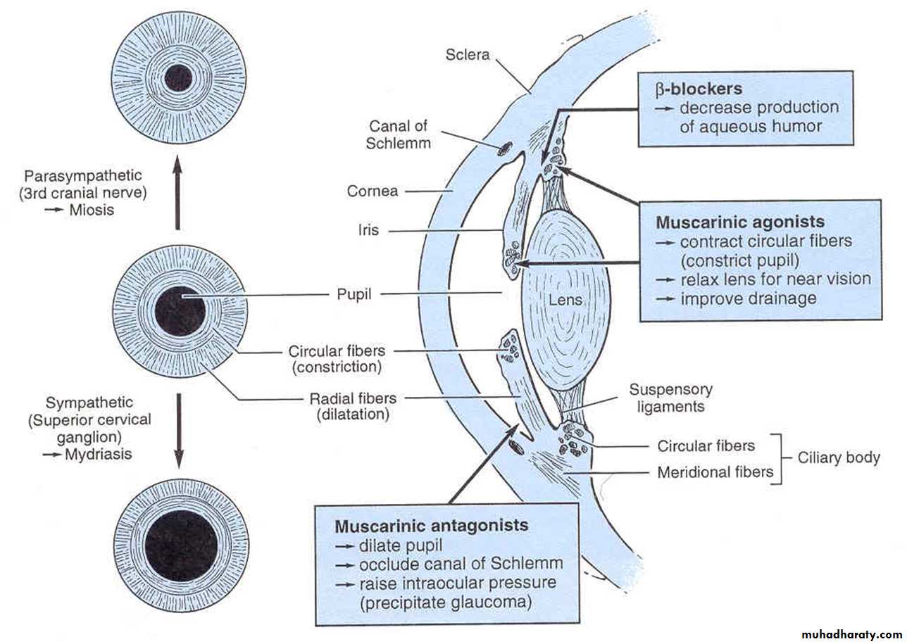 Iris:the circular coloured membrane in the front of the eye القزحية That involves: Circular muscle (Muscarinic receptors) and Radial muscle (Alpha-receptors).
