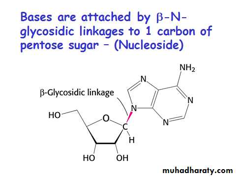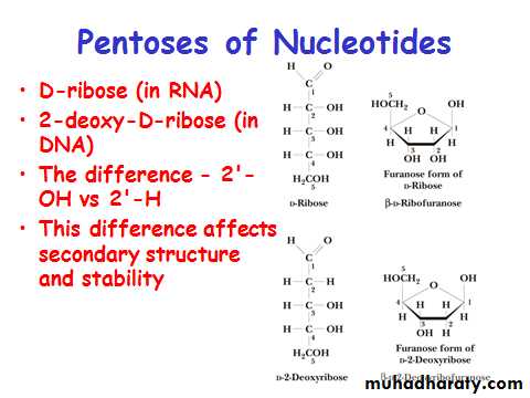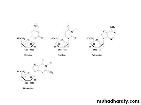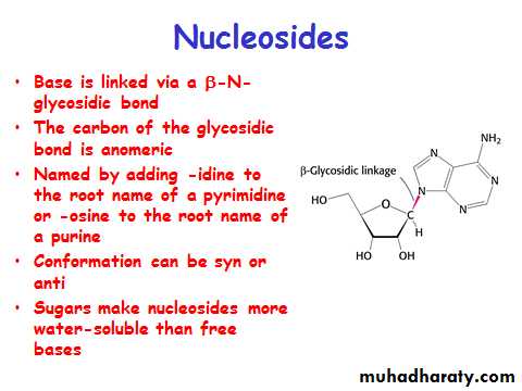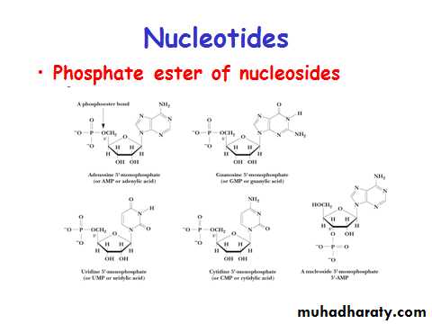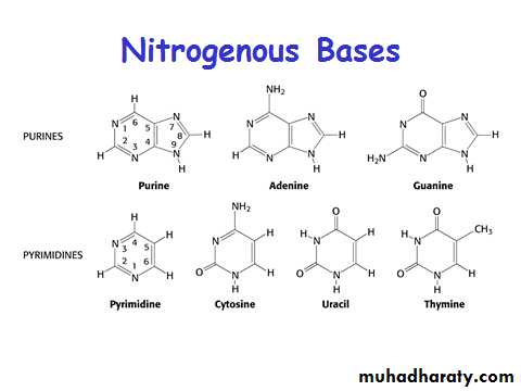 Nucleotides contain a 5 carbon sugar, a weakly basic nitrogenous compound (base) and one or more phosphate groups.