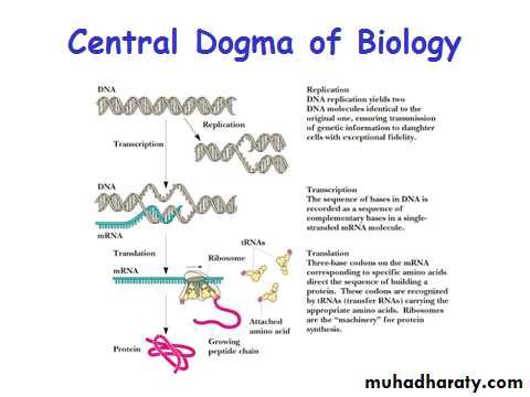 •Information encoded in a DNA molecule is transcribed via synthesis of an RNA molecule•The sequence of the RNA molecule is "read" and is translated into the sequence of amino acids in a protein.