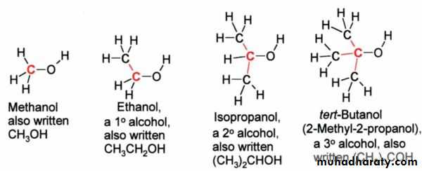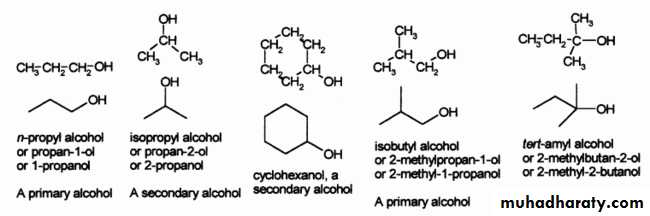 For alcohols usually takes name of the corresponding alkyl group and add the word "alcohol", e.g. methyl alcohol, ethyl alcohol or tert-butyl alcohol. Propyl alcohol may be n-propyl alcohol or isopropyl alcohol depending on whether the hydroxyl group is bonded to the 1st or 2nd carbon on the propane chain. Isopropyl alcohol is also occasionally called sec-propyl alcohol.As mentioned above alcohols are classified as primary (1°), secondary (2°) or tertiary (3°), and common names often indicate this in the alkyl group prefix. For example (CH3)3COH is a tertiary alcohol is commonly known as tert-butyl alcohol. This would be named 2-methylpropan-2-ol under IUPAC rules, indicating a propane chain with methyl and hydroxyl groups both attached to the middle (#2) carbon.