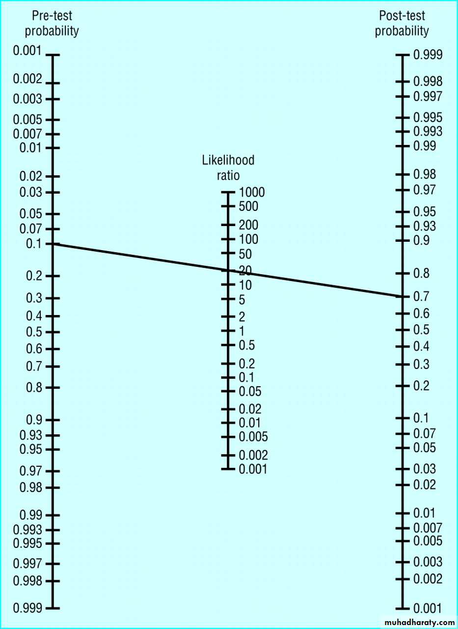 Deeks, J. J et al. BMJ 2004;329:168-169Use of Fagan's nomogram for calculating post-test probabilities: