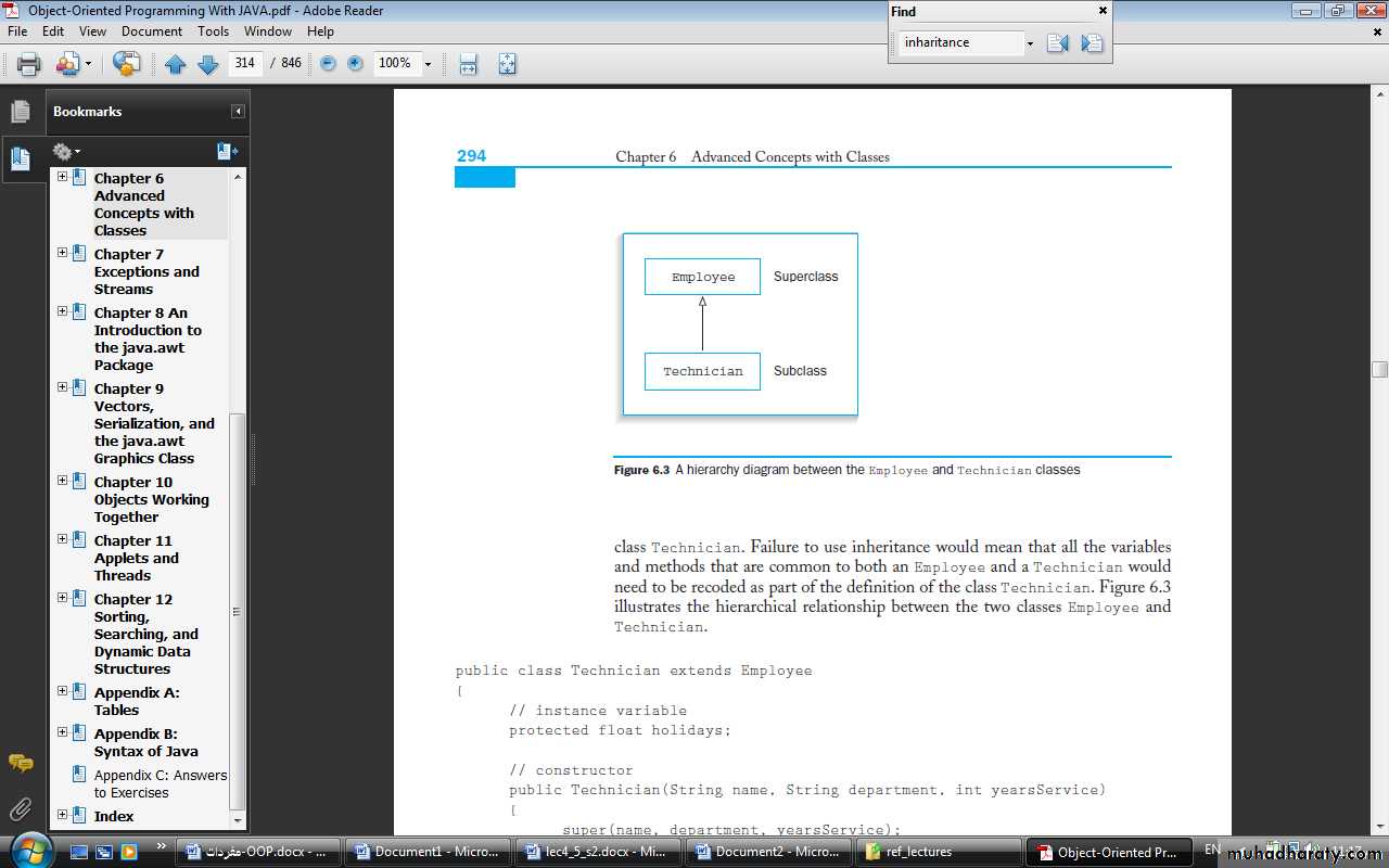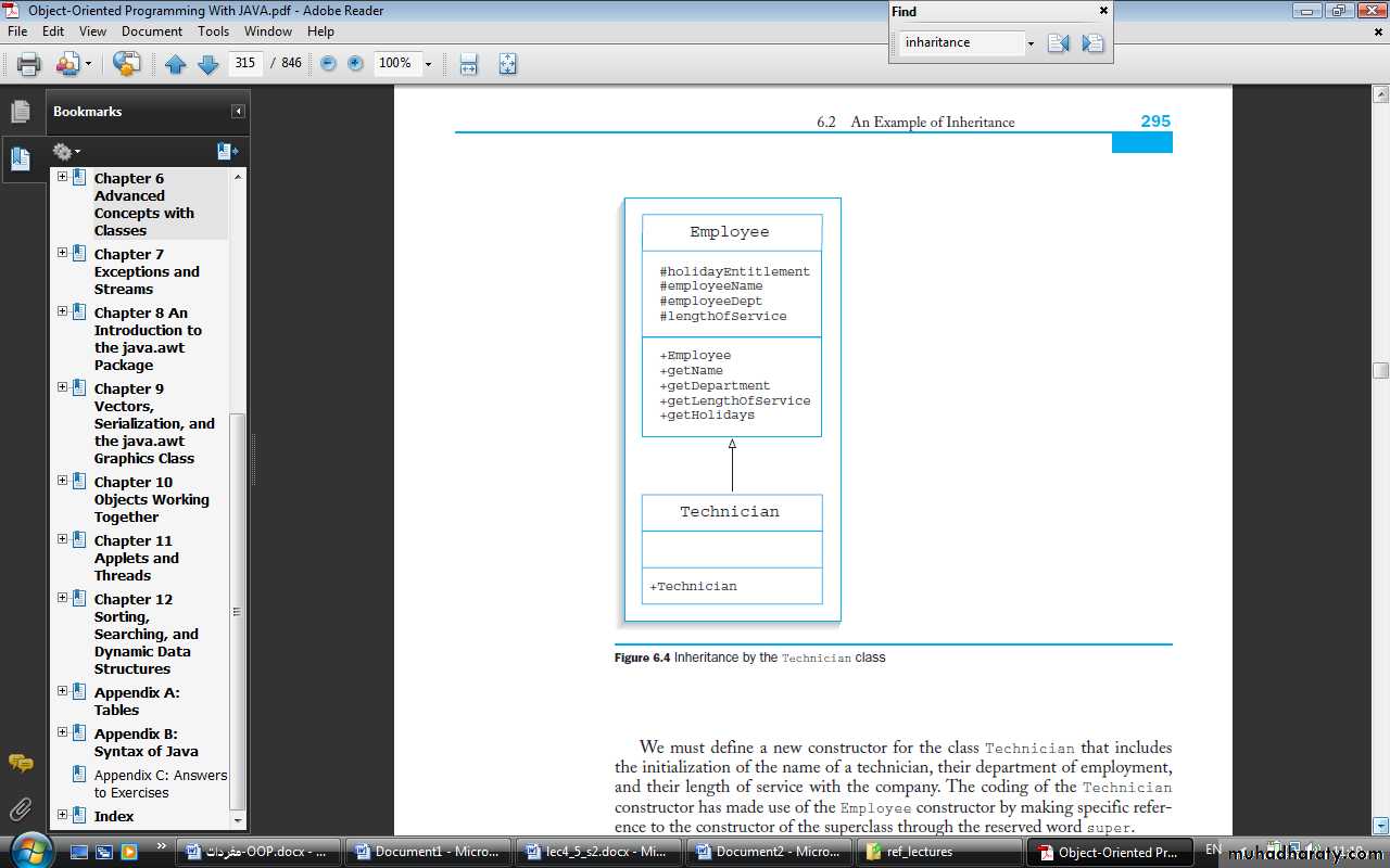 employee, the name of the department in which the employee works, and the length of time spent working for the company. Instance methods are included that return the name of the employee, the name of the department in which the employee works, the length of service, and the holiday entitlement. Suppose there is a special type of employee, which we will call a technician, who has many of the characteristics of a standard employee but also has some additional characteristics, or a few characteristics that differ from the standard employee.
