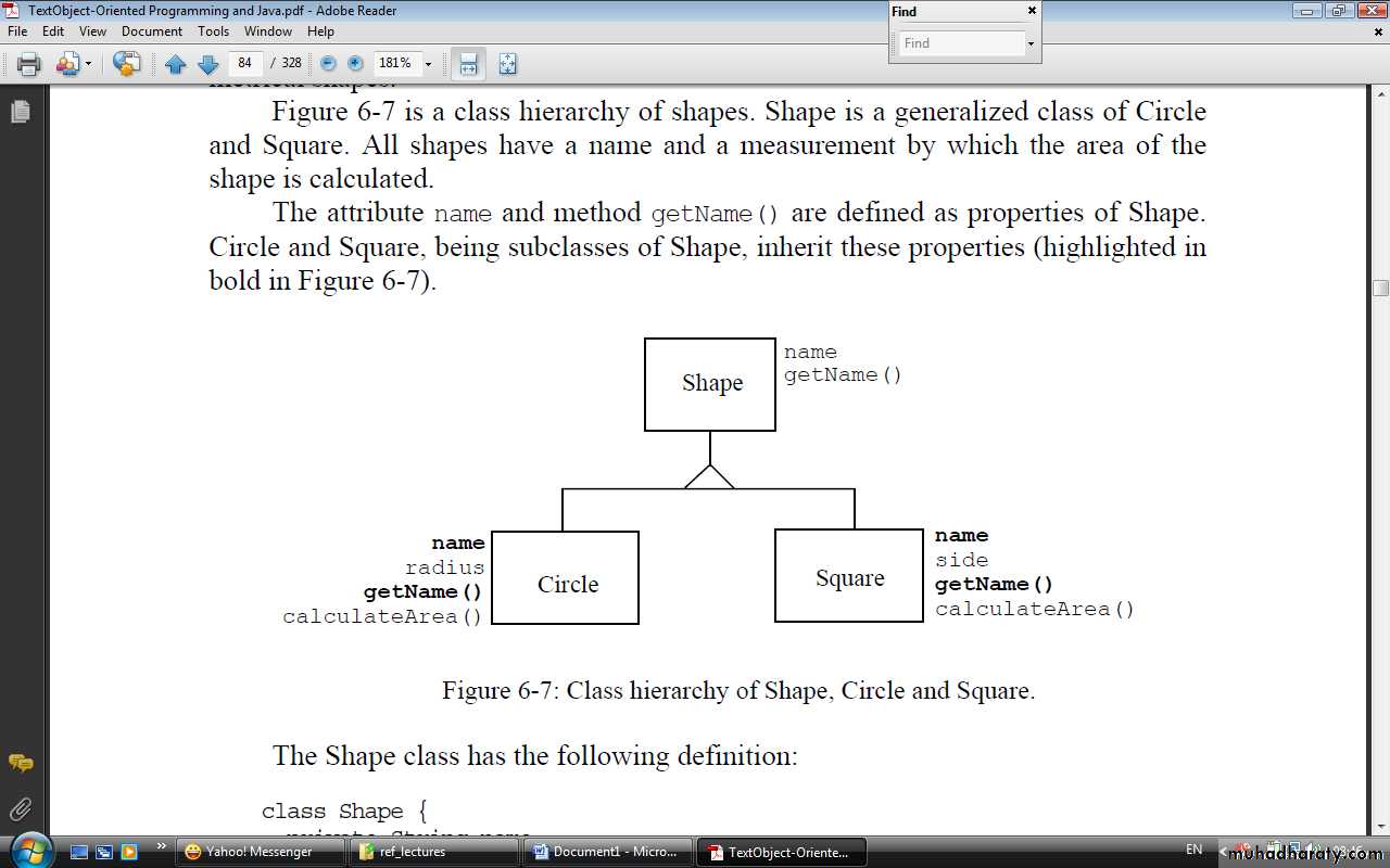 The following figure is a class hierarchy of shapes. Shape is a generalized class of Circle and Square. All shapes have a name and a measurement by which the area of the shape is calculated. The attribute name and method getName() are defined as properties of Shape. Circle and Square, being subclasses of Shape, inherit these properties (highlighted in bold in the following figure).use constructors to set the values of attributes.public class Shape {