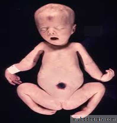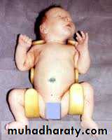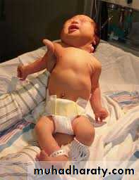 Infants who lie motionless eventually develop flattening of the occiput and loss of hair on the portion of the scalp that is in constant contact with the crib sheet.Hip subluxation or arthrogryposis suggest hypotonia in utero .