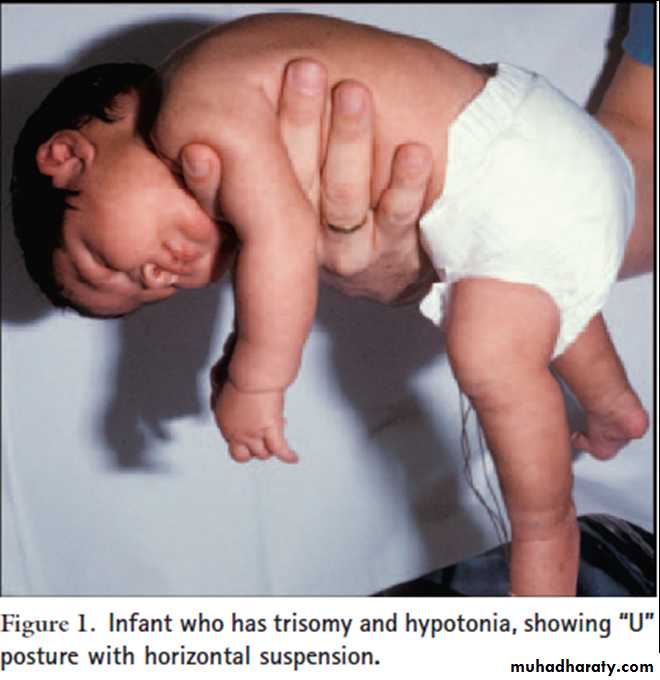 Hyptonia - infants drape over the examiner's hands, with the head and legs hanging limply