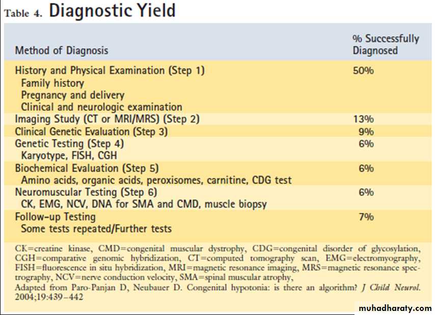 Central causes account for 60% to 80% of hypotonia cases and the peripheral causes occur in 15% to 30%.