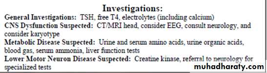 Rule out sepsis first - complete blood count , (blood culture, urine culture, cerebrospinal fluid culture and analysis);Measurement of serum electrolytes – calcium and magnesium