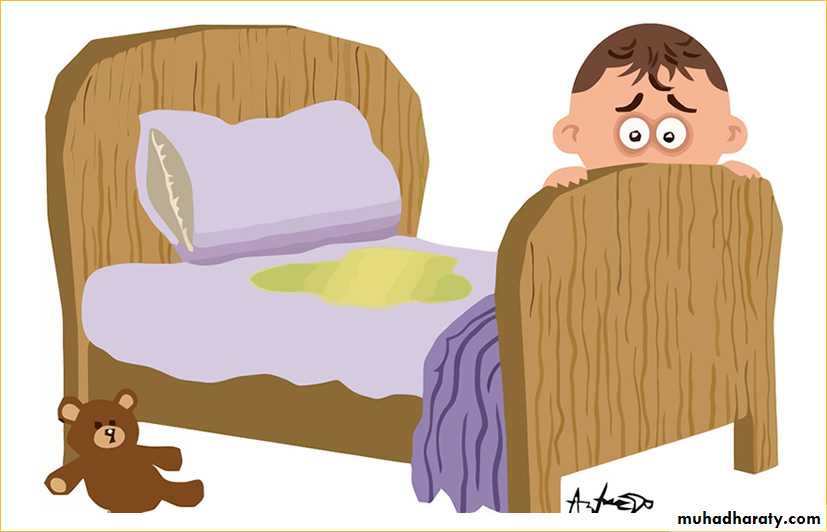 Primary (persistent) Enuresis: (70%-95%) is the condition describing the symptom of incontinence during sleep by a child who has never achieved consistent night-time dryness. This may further be subdivided into children who have enuresis only at night and those who also have daytime symptoms (urgency, frequency, or daytime wetting).Nocturnal enuresis (cont.)