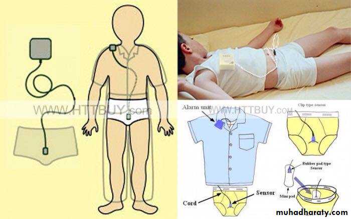Conditioning therapy involves use of an auditory alarm attached to electrodes in the underwear. The alarm sounds when voiding occurs and is intended to awaken children and alert them to void.This form of therapy is considered curative and has a reported success of 30-60%. Often the alarm wakes up other family members and not the enuretic child; persistence for several months is necessary.
