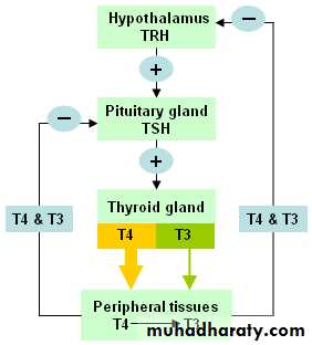 • T4 is de-iodinated into T3 and enter the nucleus of the cell via active transport where it bind thyroid hormone receptor similar to nuclear receptors of corticosteroids, mineralocorticoids, estrogen, Vit D , retinoic acid. (T3 is the only active thyroid hormone at the cellular level)