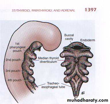 During its migration caudally, it contacts the ultimobranchial bodies developing from the 4th pharyngeal pouches.
