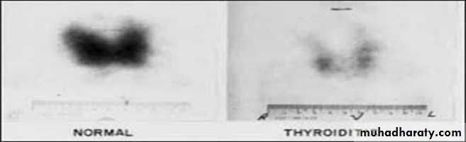 Radioactive iodine uptake is low.It is self limiting condition that subside within months.