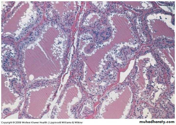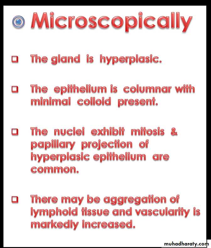 Histopthological examination show chronic inflammatory cell infiltration .Clinical features: hyperthyroidism , Euothyroid and hypothyroidism , the gland is lobulated or diffuse, the gland may be small or large and the gland is rubbery or firm in consistency depends on the cellularity and fibrosis .