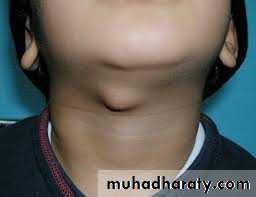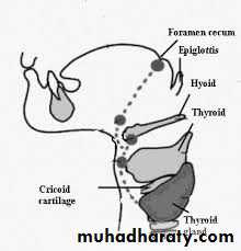 • Ectopic thyroid tissue at the foramen cecum (lingual thyroid).• Ectopic midline thyroid tissue (supra & infrahyoid).