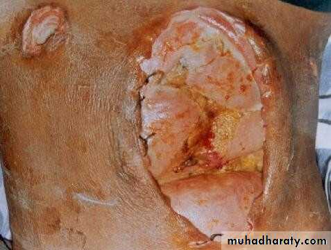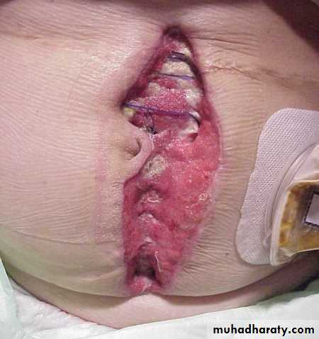 Burst abdomen(abdominal dehiscence)and incisional herniaIt occurs after 1-2% of laparotomies, mostly 6-8th day after operation, an abdominal wound bursts open and viscera are extruded. An incisional hernia usually starts as a symptomless partial distruption of the deeper layers during the immediate or early postoperative period