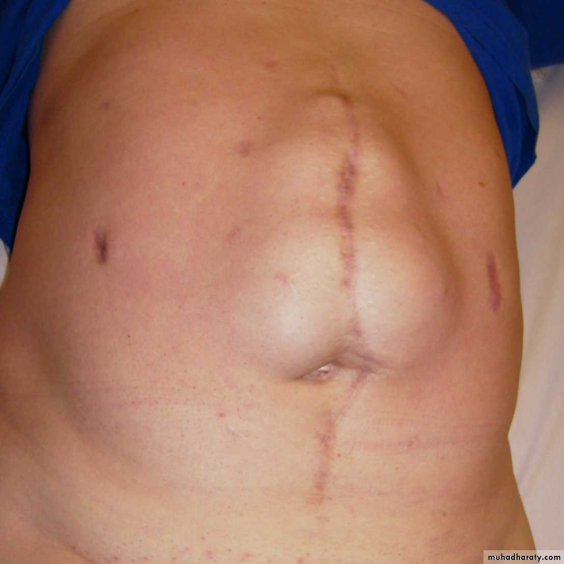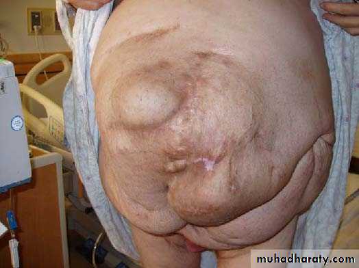 It may occur through a small portion of the scar, often the lower end. More often there is a diffuse bulging of the whole length of the incision. It usually increases steadily in size and more and more of its contents become irreducible. The overlying skin may be so thin and atrophied that peristalsis can be seen in the underlying intestine. Attacks of partial intestinal obstruction are common as strangulation is liable to occur at the neck or in a loculusTreatment