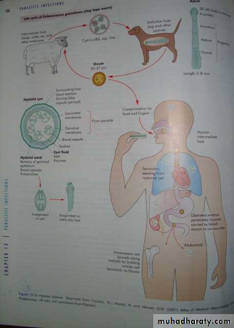 Hydatid cyst in tissue of cattle ,sheepmeat eaten by dog ,adult worm in the intestine of dog ,eggs in stool contaminate soil and vegetables ,ingested by human sheep or cattle ,larva hatch in the intestine and inter the portal circulation into the liver.