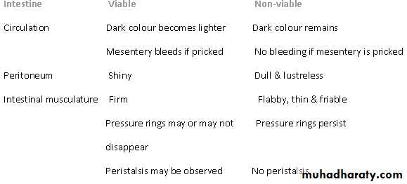 The viability of the involved bowel should be carefully assessed. If in doubt, the bowel should be wrapped in hot packs for 10 minutes with increased oxygenation & reassessed.