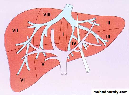 Diagram showing liver segments together with portal and hepatic venous system