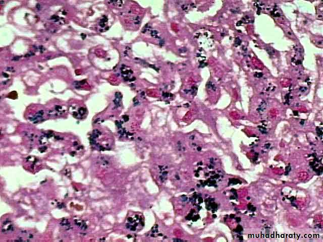 Iron stain using the Prussian Blue Reaction (x400). Hemosiderin granules stain as dark blue, coarse granules.Patterns of Hepatic Injury