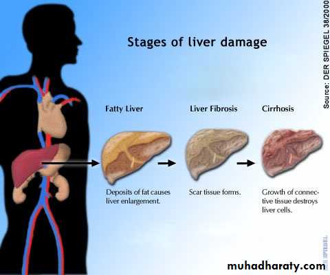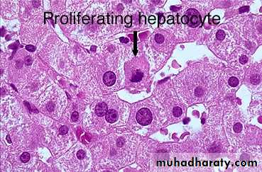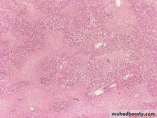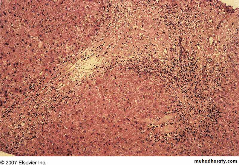 May eventually subdivide liver into nodules of proliferating hepatocytes surrounded by scar tissue CIRRHOSIS
