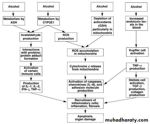 • Alcohol acetaldehyde (+) lipid peroxidation disrupt cytoskeletal and membrane function