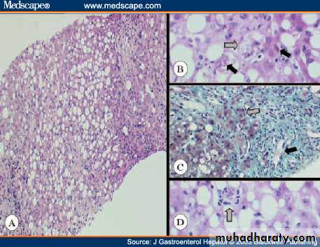 (B) (Black arrows) Mallory bodies are irregular eosinophilic cytoplasmic structures with a rope-like appearance. (Open arrow) Ballooning degeneration of hepatocytes.Histological features of alcoholic hepatitis. (c) (Open arrow) Pericellular fibrosis, also termed 'chicken-wire' fibrosis surrounds individual degenerate hepatocytes; (Black arrow) Perivenular fibrosis extends from the central vein.