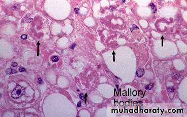 • Mallory bodies – eosinophilic cytoplasmic inclusions in degenerating hepatocytes