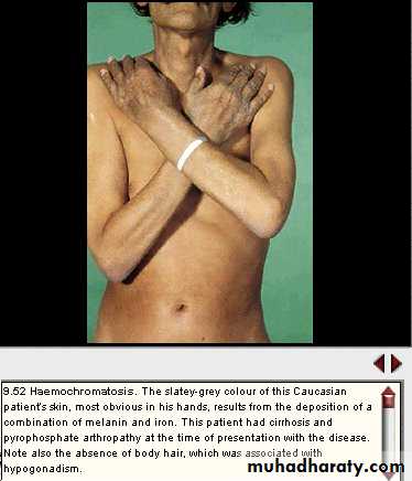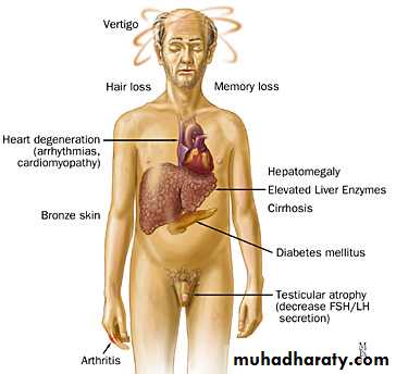 In this disease iron is deposited throughout the body and total body iron may reach 20-60 g (normally 4 g).The important organs involved are the liver, pancreatic islets, endocrine glands and heart.