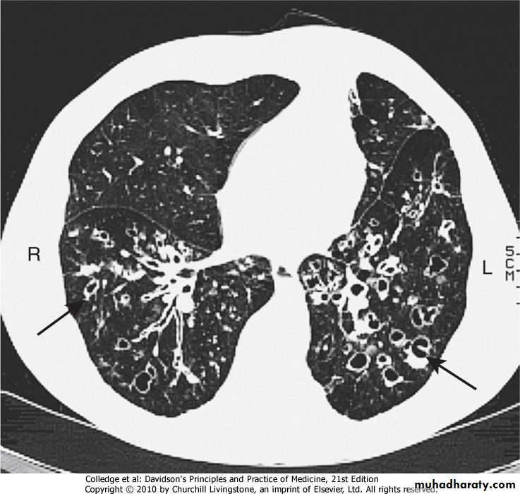 In advanced disease,cystic bronchiectatic spaces, pneumonic consolidation or collapse may be visible.