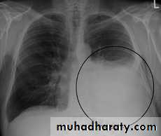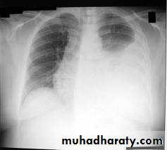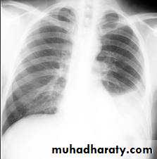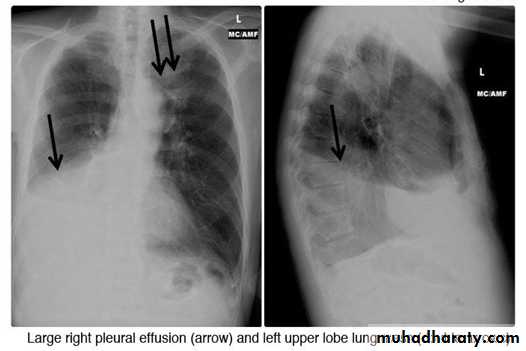 - (CXR) :The classical appearance of pleural fluid on the erect PA chest film is of a curved shadow at the lung base, blunting the costophrenic angle and ascending towards the axilla