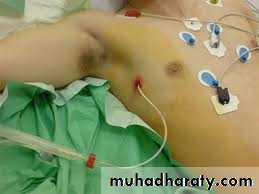 #Chest tube insertion has been recommended for patients with primary SP who failed observation and simple aspiration and for all patients with secondary SP. # In tension pneumothorax . the mediastinal contents, including the heart, are shifted to one side. Treatment consists of emergent needle decompression repeated spontaneous pneumothorax should be treated by pleurodesis or surgical intervention (including parietal pleurectomy)