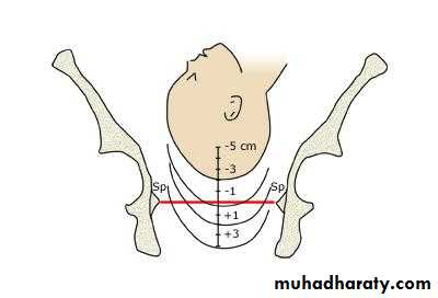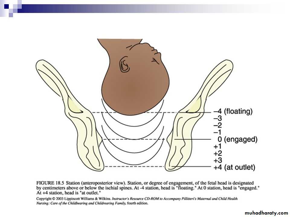 Station. The level of the presenting fetal part in the birth canal is described in relationship to the ischial spines, which are halfway between the pelvic inlet and the pelvic outlet.