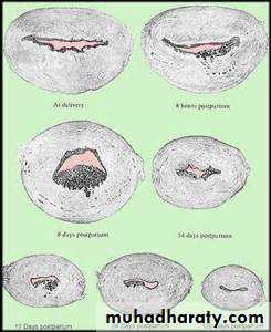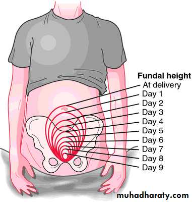 The involution state is assessed by looking at the fundal height and consistency of the uterine fundus plus the character and amount of lochia every 4-6 hours postpartum.The uterus is obviously stretched during pregnancy. Once finished with the birthing process, the fundus of the uterus may rise but them decreases in height by 1 cm per day. By one week postpartum, the fundus may no longer be palpable through the abdomen and the entire size of the uterus is about the size of a grapefruit, round and smooth but firm.