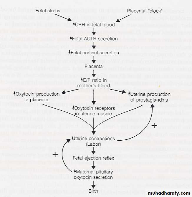 There is considerable evidence, however, that there is a placental-pituitary adrenal axis that may play a key role in the timing of human parturition. Activation of the human fetal hypothalamic-pituitary-adrenal axis is considered a critical component of normal parturition.Mechanism of initiation of labor may depend on an: