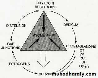 There is a cell to cell communication system by means of Gap Junctions which facilitates the passage of metabolic products and electrical current between the cells.These gap junctions increase in size and number with the actual labor and disappear afterwards. (Prostaglandin stimulate their formation).
