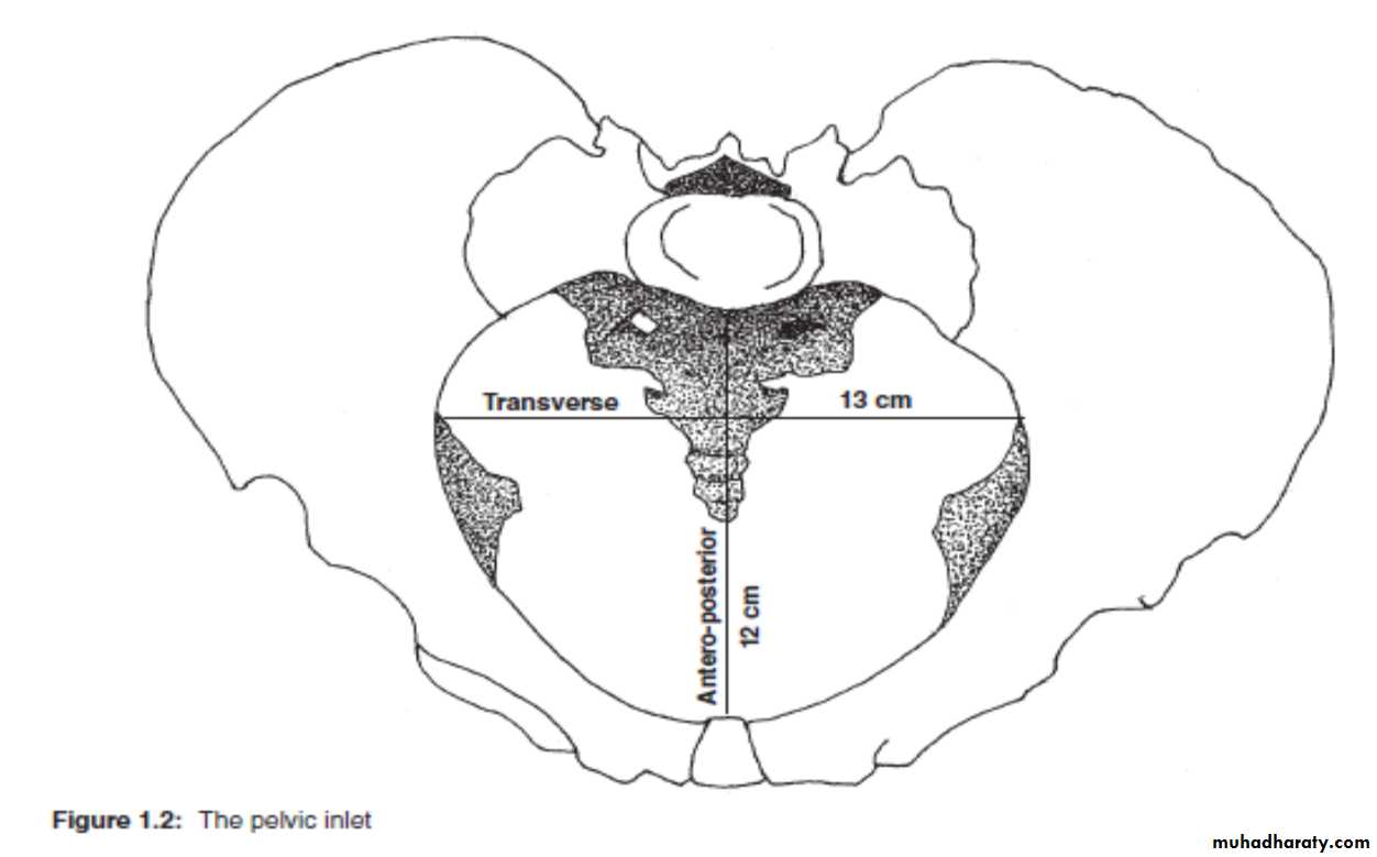 Inlet contraction is suspected if the antero posterior diameter of the pelvis is less than 10 cm, the transverse diameter is under 12 cm, or both.