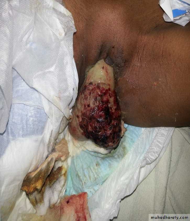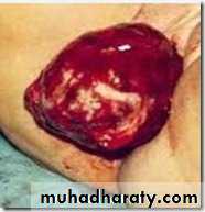 A dark red-blue bleeding mass is palpable and often visible at the cervix, in the vagina, or outside the vagina.