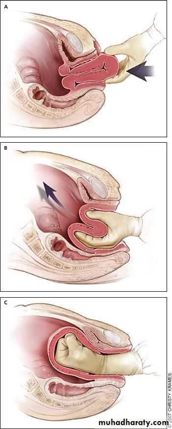 Immediate bimanual uterine compression, which may have to be continued for 20–30 minutes or more.