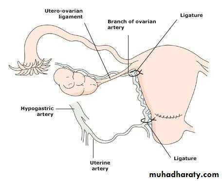 b. Uterine artery ligation— During pregnancy, 90% of the blood flow to the uterus is supplied by the uterine arteries. Direct ligation of these easily accessible vessels can successfully control hemorrhage in 75–90% of cases, particularly when the bleeding is uterine in origin. Recanalization can occur.