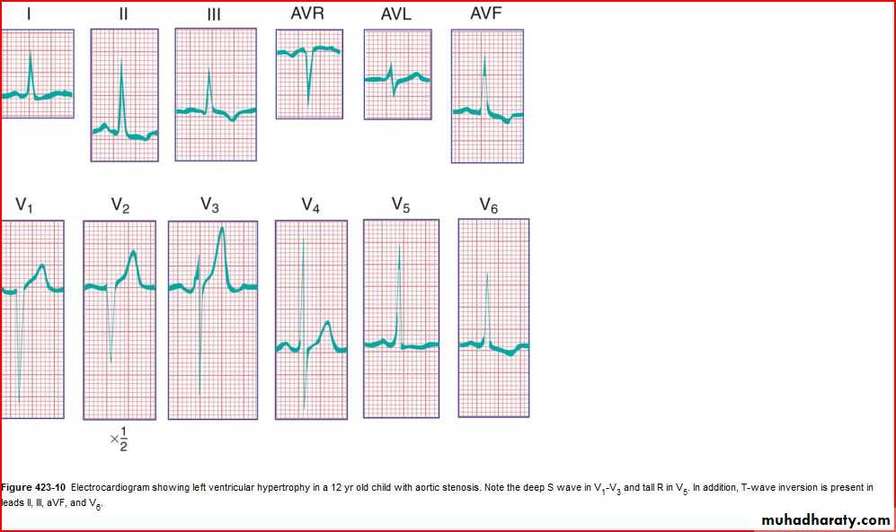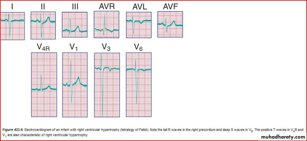T wave inversion: Infants older than 48 hours of age should have inverted T waves in the right praecordial leads. These findings persist throughout childhood with inversion to V4 being accepted as normal. There is a progressive change to an upright T wave across the praecordial leads from left to right as the child grows older. Until 8 years of age an upright T wave in V1 is considered a sign of right ventricular hypertrophy. Many children will show persistence of an inverted T wave in V1 until their late teens
