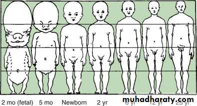 Don’t progress at the same rate (↑ periods of GR in early childhood and adolescents & ↓ periods of GR in middle childhood)Not all body parts grow in the same rate at the same time, body proportions follow a predictable sequence of changes with development. The head and trunk are relatively large at birth, with progressive lengthening of the limbs throughout development, particularly during puberty.