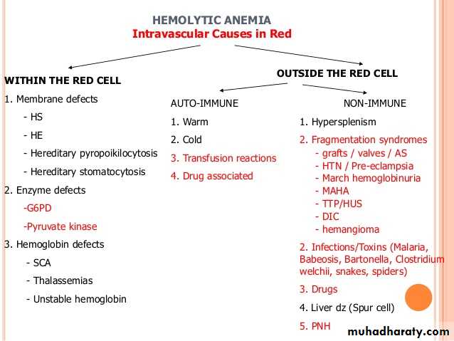 2. Inadequate RBC producation ( iron difficiency anemia, vitamin B 12 difficiency , folic acid difficiency , anemia of chronic diseases )3. RBC destruction ( hemolysis, which is either caused by intrinsic causes like defect in the hemoglobin chain e.g thalasemia, defect in the membrane e.g spherocytosis , or defect in the enzymes e.g G6PD difficiency ,, or caused by extrinsic factors like infection & drugs.