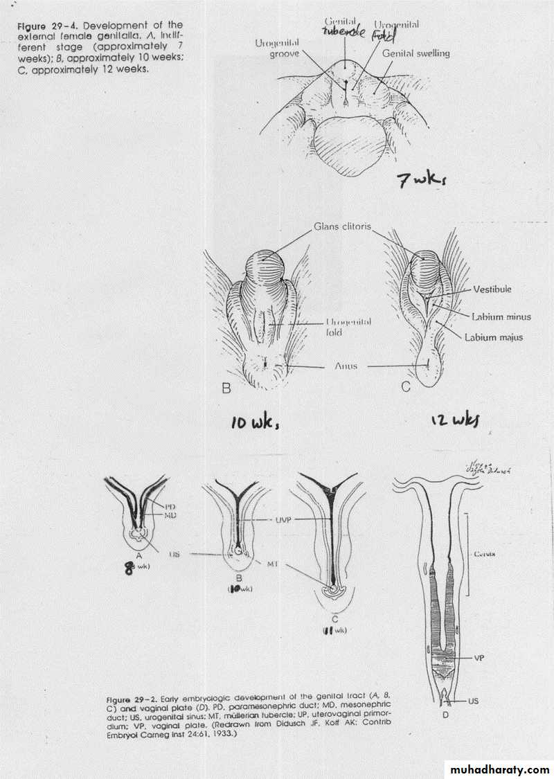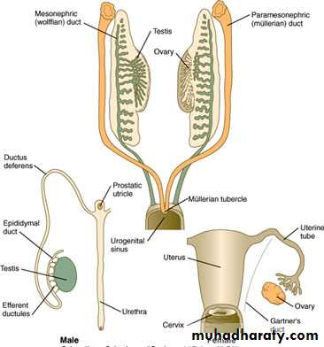 At the beginning of the third month the Mullerian and the wolffian ducts and the mesonephric tubules are all present and capable of development. In the female there is degeneration of the wolffian system and marked growth of the Mullerian system .In the male the opposite will occurs as a result of the production of the Mullerian inhibitory Substance(MIF) produced by the fetal testis.
